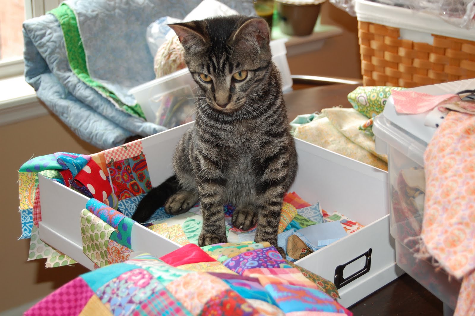 I'm having a blast! This is the happiest quilt! Amazing that fabric I would "never" put together look great in this 36 patch block! I mean 30's with Kaffe with a bit of "Piece of cake plaid"...say what? I love it!I like knowing I hit almost every fabric hiding spot on the house and that I am not just using the same old fabrics.